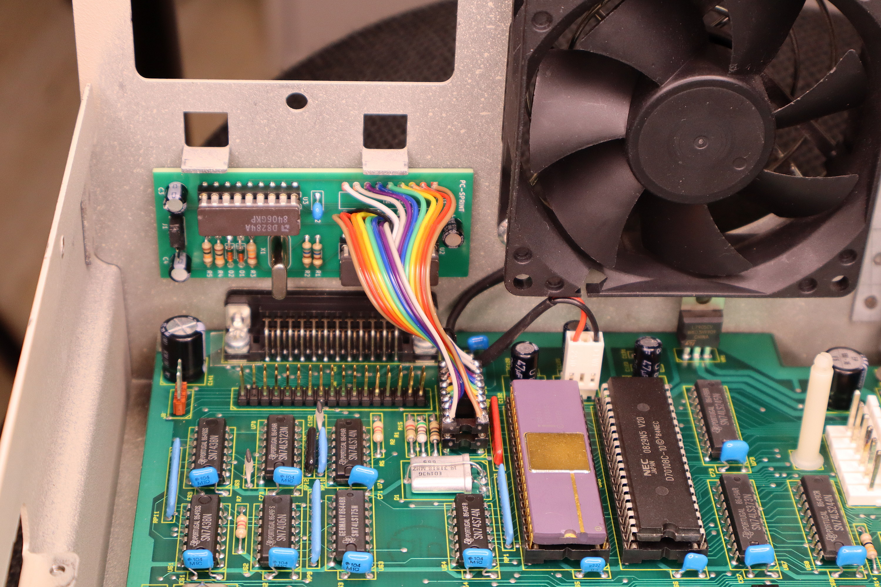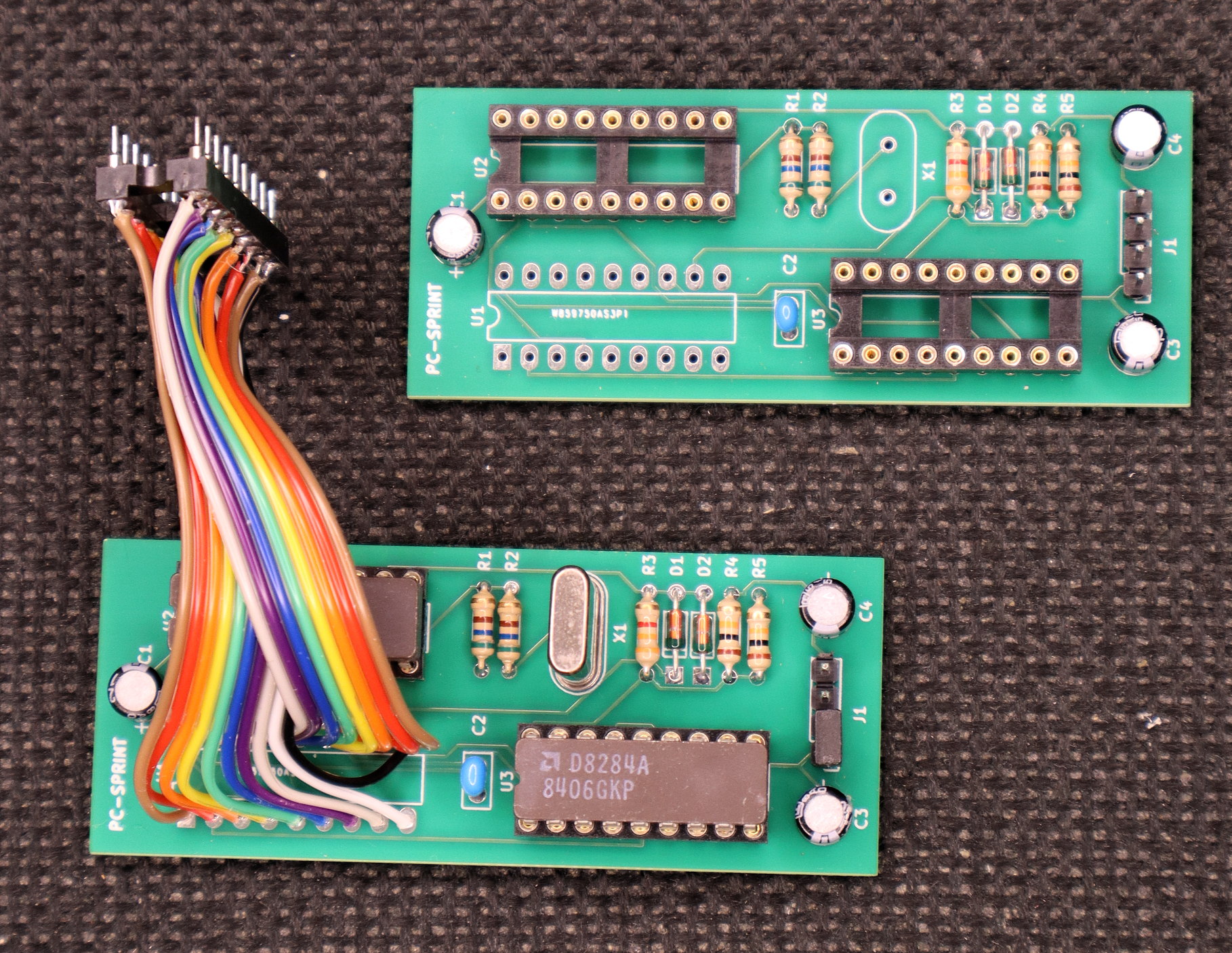 Fortunately there is just enough room on the inside of the case between the motherboard and the power supply chassis for the PC-Sprint to be mounted. A short cable can then be used to interface the PC-Sprint to the previously added socket on the Sidecar motherboard. Below is a view of a PC-Sprint modified with a cable with 18 pin plug on the other end, suitable for plugging into the IC socket. Cable length is approximately 8cm. Another partially completed PC-Sprint is also shown.